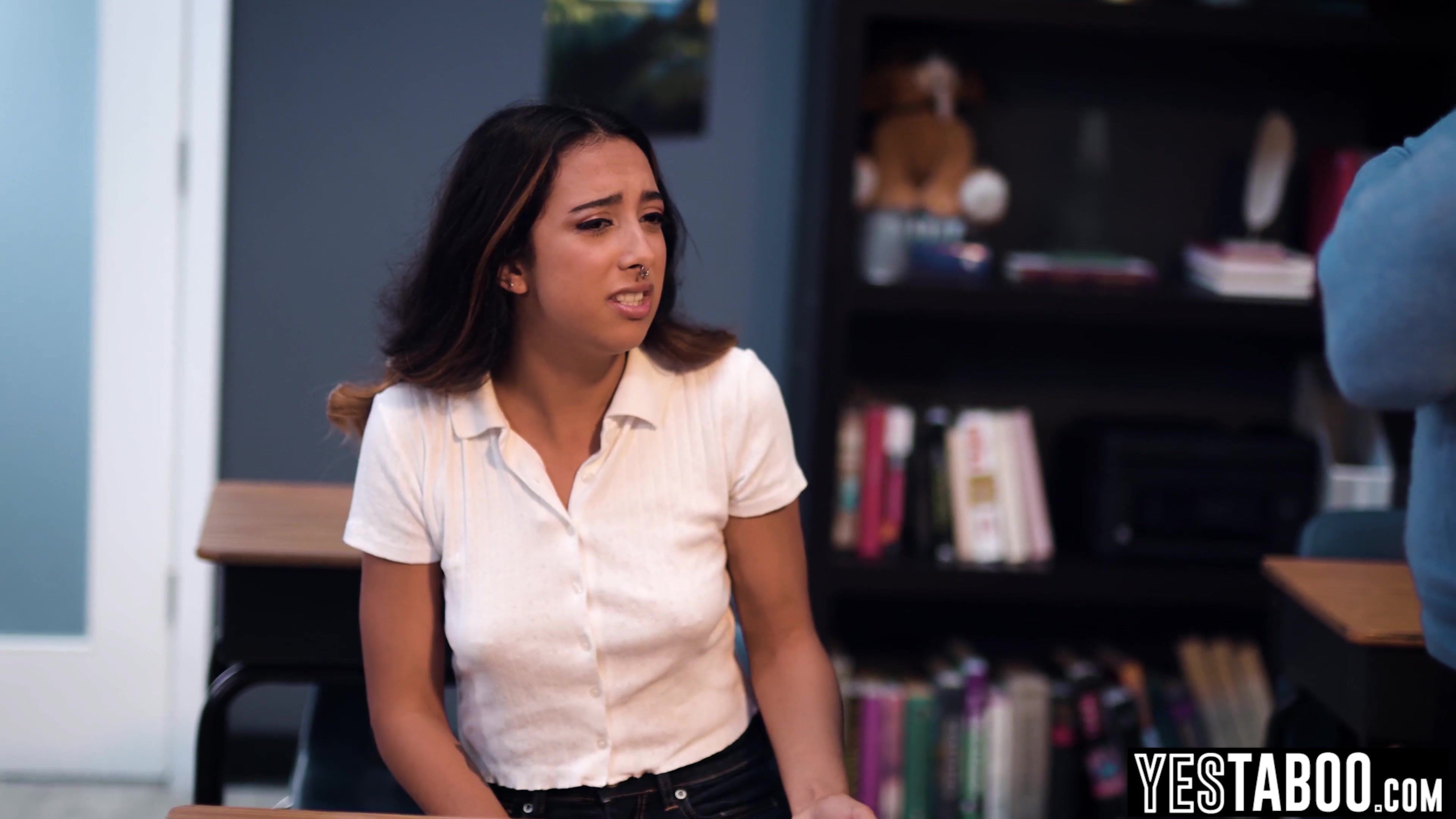 Petite tattooed Latina school girl Kiarra Kai needs to satisfy her stepdad as he is a teacher at her school so she lets him finger her hairy teen pussy and eat it out in his classroom before she has to blow his big dick and let him pound her hardcore too!